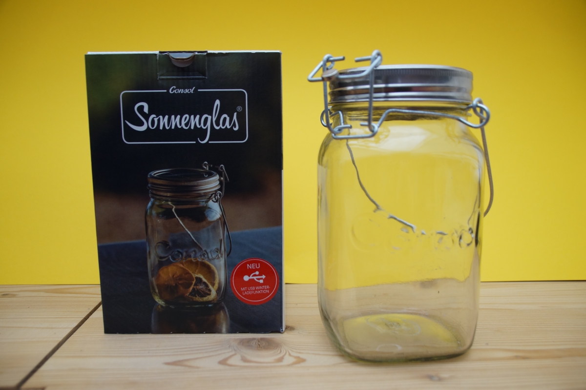 Schaut man nicht so ganz genau hin, könnte man meinen, es handelt sich um ein Einmachglas mit einem Bügel zum Aufhängen. Wenn da nicht die blau schimmernde Solarzelle im Deckel wäre.