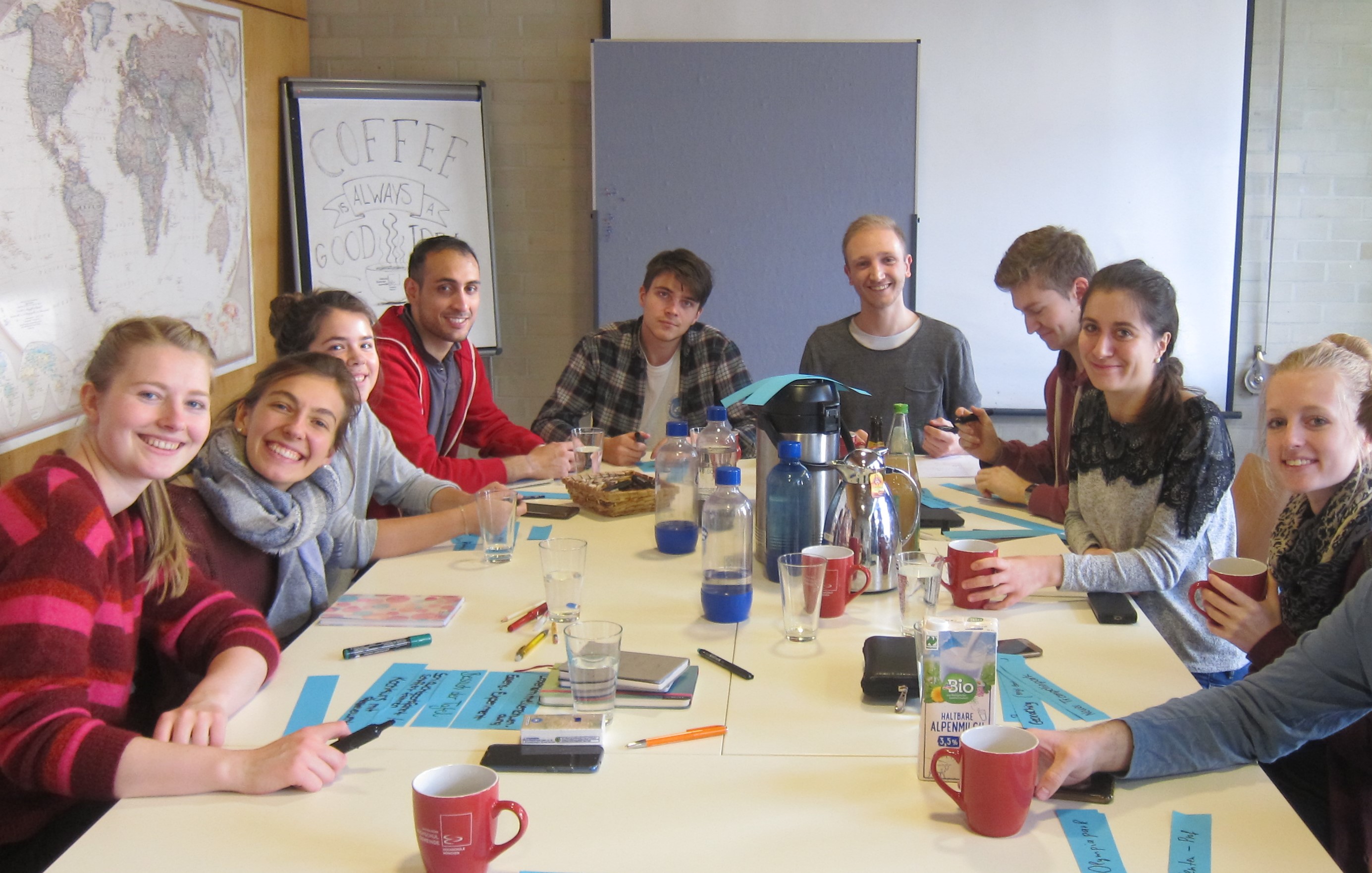 Ein regelmäßiger Anlass für alle, faire Produkte zu genießen, ist z.B. die offene „Coffeetime“ am Mittwoch Nachmittag mit Kaffee, Tee und selbst gebackenem Kuchen oder die Planungstreffen der Student*innen (Foto oben).