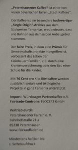 Und da bisher auch der vollständige Name und die Adresse des Lebensmittelunternehmers und zusätzlich (zur Angabe auf der eigentlichen Verpackung) ein nochmaliger Verweis auf das Mindesthaltbarkeitsdatum fehlten, haben wir ein Etikett für die Rückseite gestaltet. Mit ein paar zusätzlichen Angaben, wie die Kaffeebauern im Mahenge Hochland vom Fairen Handel profitieren und dass dieser von FLOCERT kontrolliert wird.