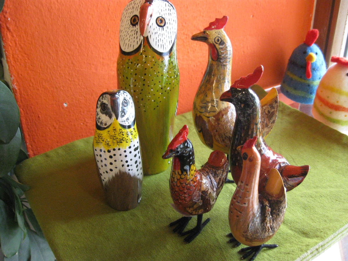 Nicht essbar, aber trotzdem sehr schön wirken die Eulen und naturgetreu bemalten bunten Hühner aus Kenia. Das Besondere an ihnen: Sie sind jeweils aus einem Mangoast geschnitzt und von der Aldersbacher Fairhandelsbrücke importiert. Vielleicht möchten Sie Ihre Kinder ja am Ostermorgen mit einem kleinen Hühnchen aus Kenia überraschen ?