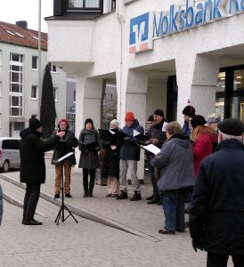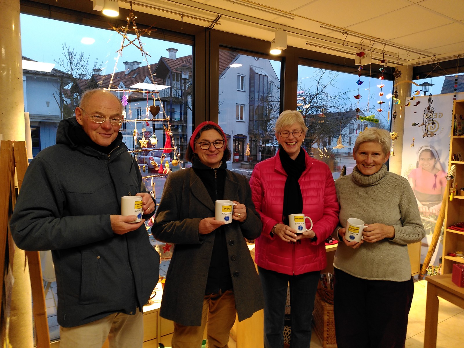 Bei uns im Fairkaufladen konnte man fair gehandelten, weißen Glühwein genießen. Die Tassen für den Glühwein wurden vom Gewerbeverein Petershausen gestellt und durften behalten werden. Zwischen 14 und 15 Uhr trat der Gemischte Chor Petershauen mit vorweihnachtlichen Liedern am Kreisverkehr auf. Bei Hannahs Bioladen konnte man sich mit Krautspätzle für den Weihnachtsbummel in den umliegenden Geschäften und im Fairkaufladen stärken.