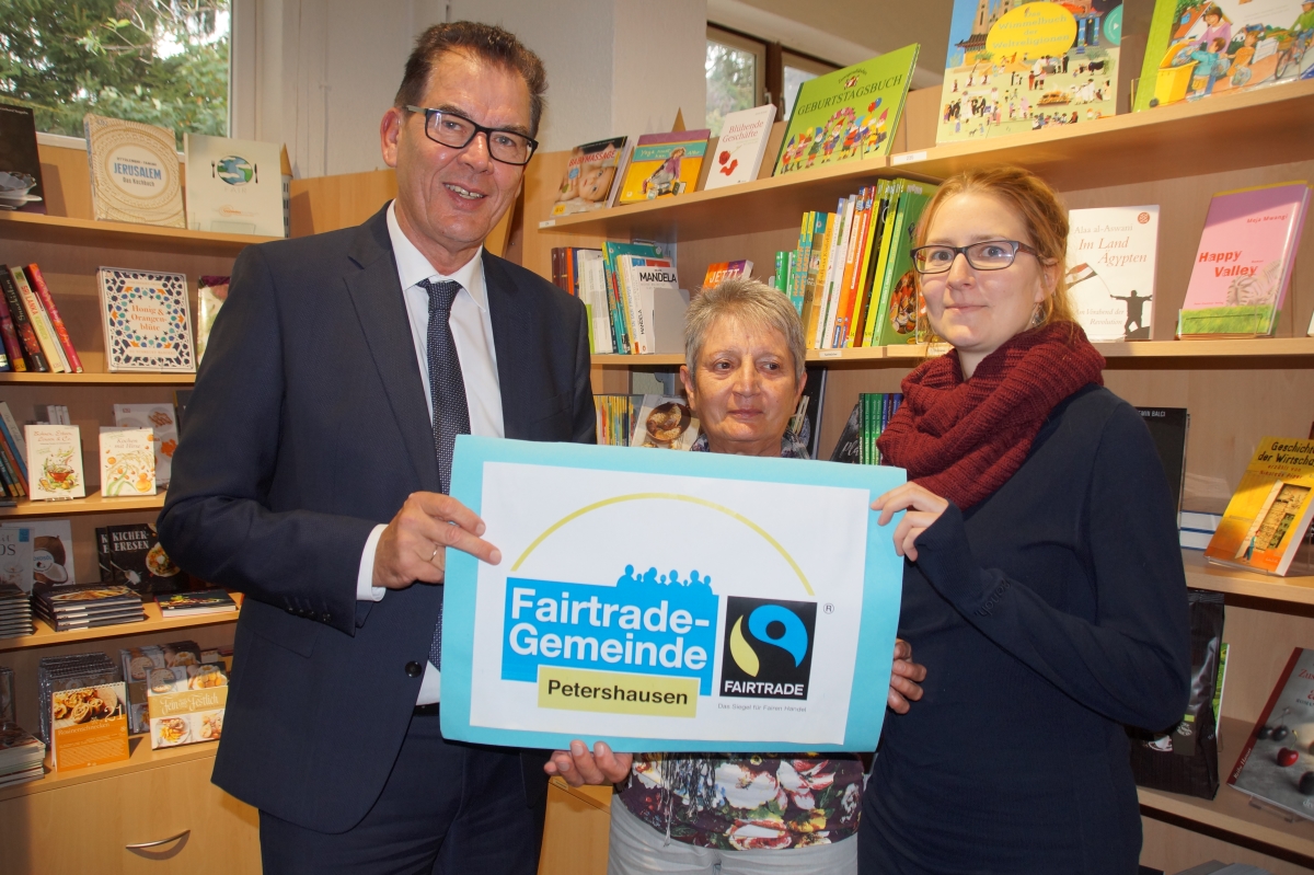 Foto: Dr. Gerd Müller mit zwei Mitarbeiterinnen des Fairkaufladens