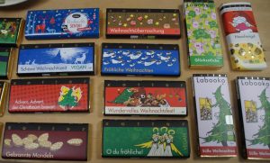 Und auf einem separaten Tisch liegen Zotterschokoladen mit weihnachtlichen Motiven und Genüssen.