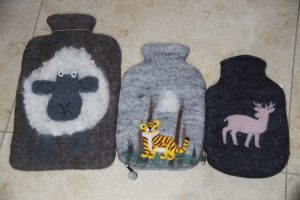 Produkte aus Filz wie Filzbezüge für Wärmeflaschen mit unterschiedlichen Motiven und Größen sowie ein Filzuntersetzer und ein Adventkranz kommen von den Fairhandelsorganisationen  ARTISAN COMMUNITY und Hatale in Nepal.