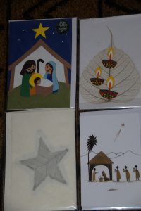 Mit Karten aus Altpapier (Cards from Africa, Ruanda), Karten auf der Basis getrockneter Blätter des Bodhi-Baumes (Premalaya Handycrafts Trust, Indien), der Rinde des  Maulbeerbaums (Nordthailand) und aufgeklebter Bananenfaser (Kepocko, Kenia) bieten wir auch ein schönes Sortiment unterschiedlicher handgefertigter Weihnachtskarten.