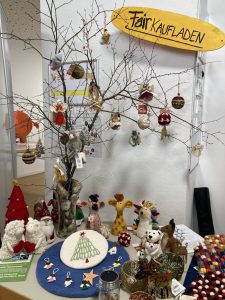 Neben Malereien, handgefertigten Seifen, Produkten aus Holz, Wachs, Keramik, Metall oder Papier von verschiedenen Ausstellern zeigte auch der Fairkaufladen wieder einen Teil seines Kunsthandwerksortiments aus aller Welt. Produkte aus Filz wie Blumen, ein Kranz, Untersetzer, Sitzkissen, Eierwärmer, eine Krippe, Christbaumkugeln und andere Anhänger von Produzenten aus Nepal wechselten ab mit dekorativen Schalen aus Speckstein, Mukwaholz und der Ilalapalme (Tongaschalen), Figuren aus Serpentenit und genähten Taschen sowie Schlüsselanhängern von Produzenten aus Simbabwe.