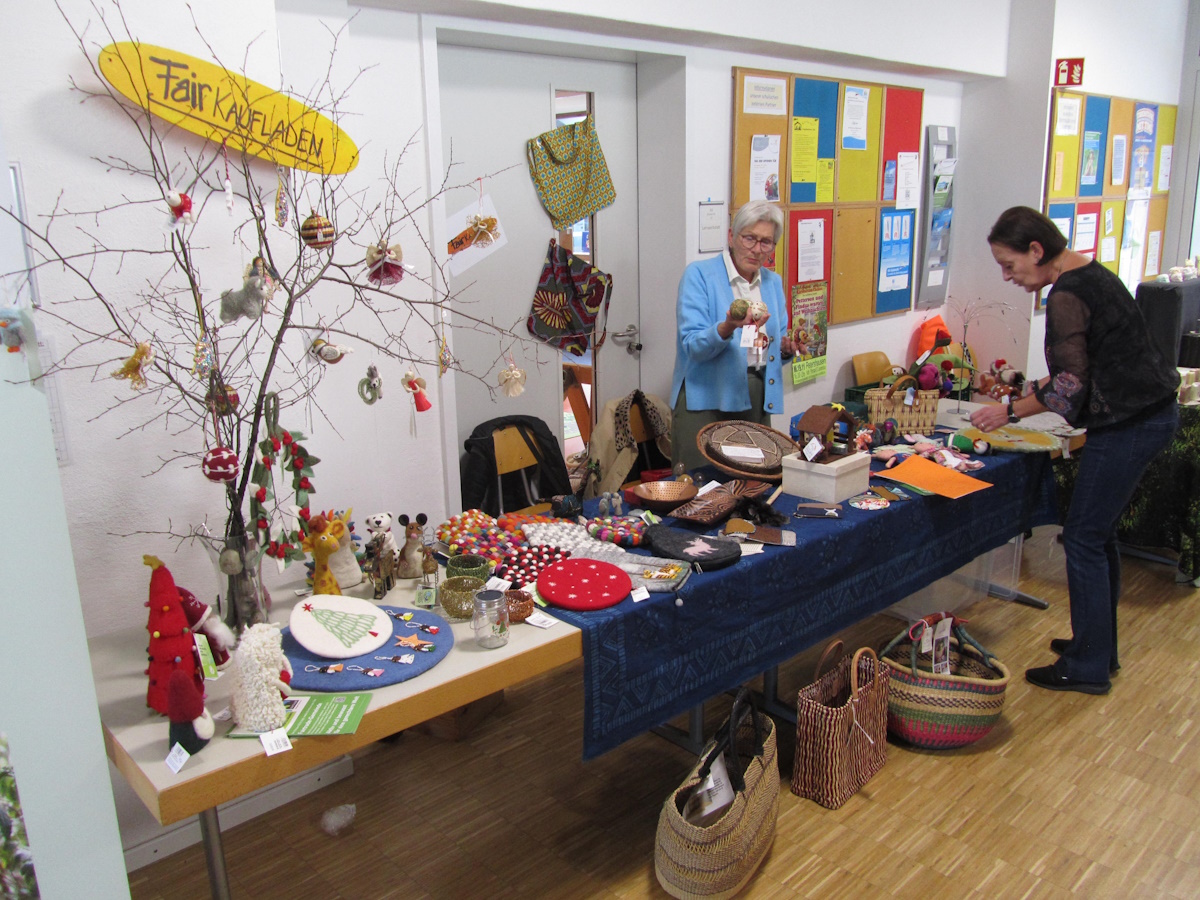 Neben Malereien, handgefertigten Seifen, Produkten aus Holz, Wachs, Keramik, Metall oder Papier von verschiedenen Ausstellern zeigte auch der Fairkaufladen wieder einen Teil seines Kunsthandwerksortiments aus aller Welt. Produkte aus Filz wie Blumen, ein Kranz, Untersetzer, Sitzkissen, Eierwärmer, eine Krippe, Christbaumkugeln und andere Anhänger von Produzenten aus Nepal wechselten ab mit dekorativen Schalen aus Speckstein, Mukwaholz und der Ilalapalme (Tongaschalen), Figuren aus Serpentenit und genähten Taschen sowie Schlüsselanhängern von Produzenten aus Simbabwe.