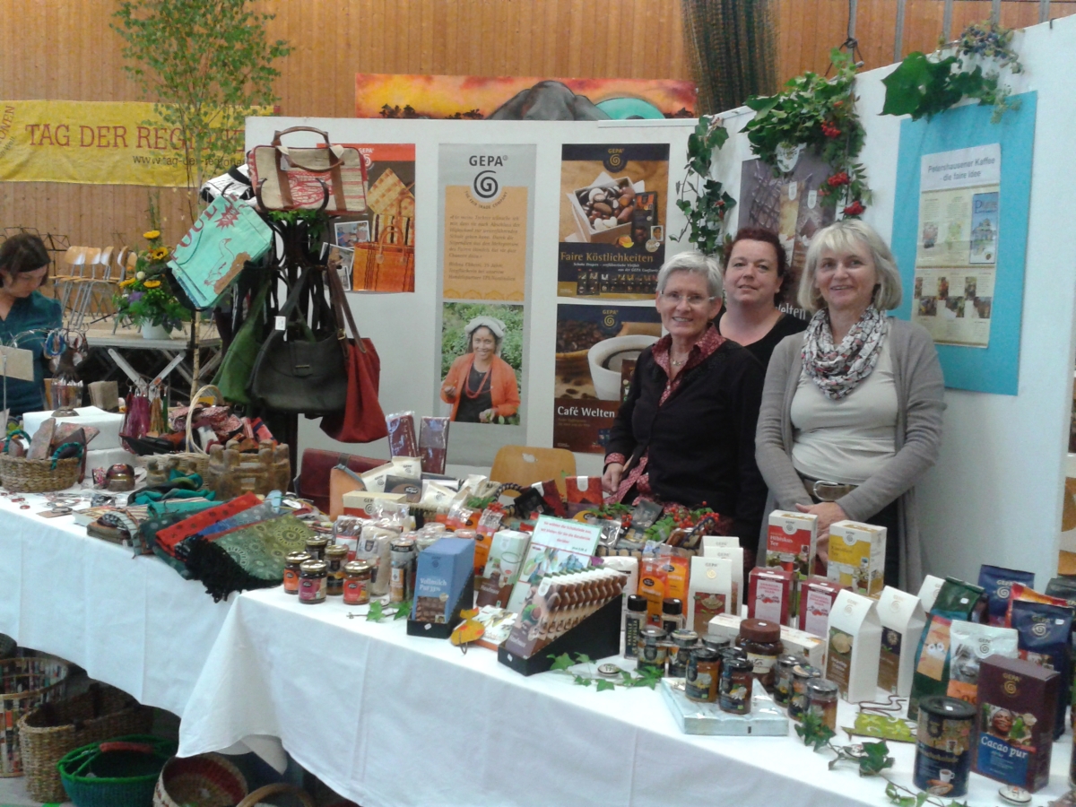 Ein Höhepunkt im Lauf des Tags der Regionen war die Auszeichnung zur Fairtrade-Gemeinde Petershausen. Eine Auszeichnung, die sicher eng verbunden ist mit der Präsenz des Weltladens und des ehrenamtlichen Engagements von etwa 20 Frauen, die den Laden und damit das Thema Fairer Handel seit mehr als 13 Jahren am Laufen halten. Sehr hilfreich war aber auch die engagierte und kompetente Organisation seitens der Gemeindeverwaltung durch Katja Buchta (auf deren Anregung die Bewerbung zustande kam) und Elmira Führer (die die begonnene Arbeit bis zur Bewerbung weiterführte).