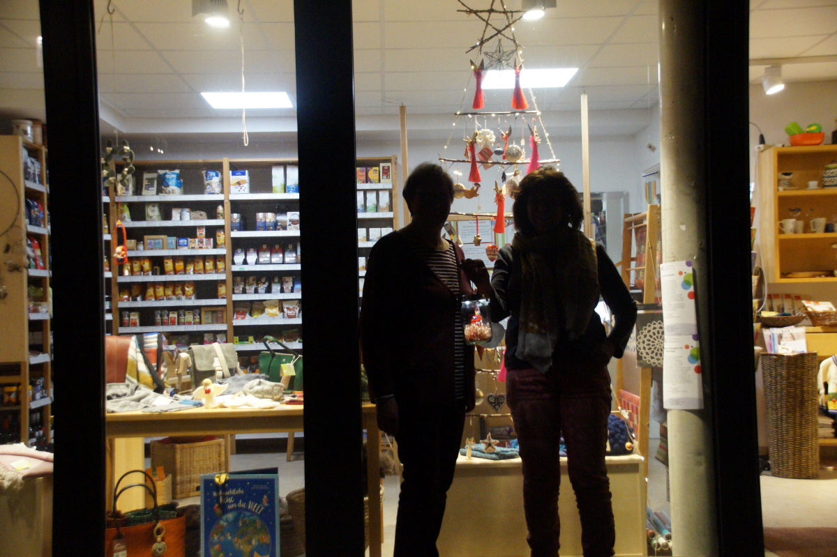 vor dem Fairkaufladen: Die Mitarbeiterinnen Ursel und Ursula mit „Sonnenglas“ aus Südafrika