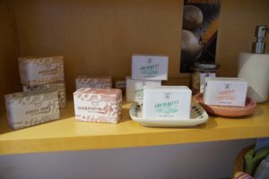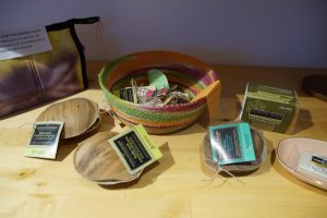 Weitere Produkte sind Kulturbeutel/Kosmetiktaschen aus recyceltem Leder von Tranquillo, eine Biobu- Aufbewahrungsbox aus Bambus, Seifenschalen aus Keramik, eine Alepposeife und Eza- und Gepa- Seifen aus dem Palam Rural Center in Indien. Von letzteren haben wir in einem Regal noch ein größeres Sortiment. Die natürlichen, in handgeschöpftem Recyclingpapier verpackten Seifen, werden aus wertvollen Pflegestoffen wie Kokos-, Neem- und Mohuaöl, das aus dem „Indischen Butterbaum“ gewonnen wird, hergestellt. Palam kauft diese Rohstoffe vorzugsweise von Kooperativen indischer Kleinproduzent:innen. Die hochwertigen Seifen bewirken eine besonders sanfte Reinigung, wirken rückfettend und bewahren die Haut vor dem Austrocknen.