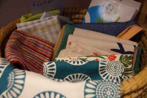 Zum Thema Sauberkeit und Spülen passen auch die handgewebten Geschirrtücher von El Puente und der Gepa. El Puente lässt die Baumwollgeschirrtücher von der Fairhandels-Organisation „Fair Gift“ in Südindien produzieren, die Gepa von „CO-OPTEX“, einem großen Kooperativen-Dachverband zur Förderung der Handweber*innen in Tamil Nadu.