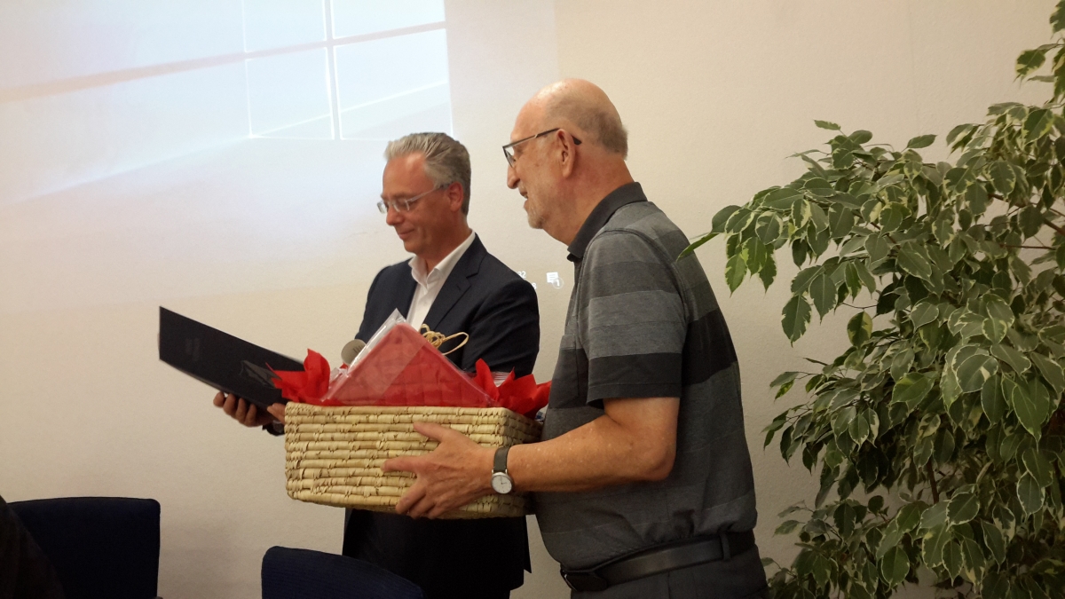 Foto: Bürgermeister Marcel Fath überreicht Wolfgang Stadler (rechts) Urkunde und Geschenkkorb