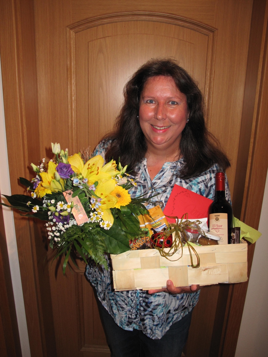 Mit einem bunten Blumenstrauß, einem Geschenkkorb mit bio-fair-regionalen Lebensmitteln und einem Geschenkgutschein aus dem Fairkaufladen verabschiedeten Rainer Mühe und Erna Feicht die langjährige 1. Vorsitzende der BN- Ortsgruppe Claudia Siegl.