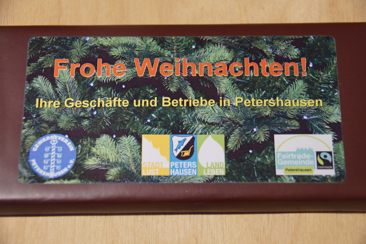 Das schon vom letzten Jahr bekannte weihnachtliche Label wurde auf zwei Varianten (Zartbitter und Vollmilch) der labelfreien Gepa-Schokolade geklebt. Es zeigt die drei Logos von Gewerbeverein, Gemeinde Petershausen und Fairtrade-Gemeinde Petershausen.