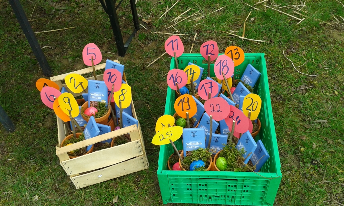 Im Fall des Gartenbauvereins hatte er den Auftrag, 50 fair gehandelte Schoko-Osterhasen für die Osternester im Pflanzgarten zu besorgen. Nur leider war das Lager für faire Osterhasen in Osterhasenpettenbach ziemlich leer geräumt. Aber flexibel und schlau wie der Osterhase ist, hat er sich kurzerhand für 50 faire Vollmilchschokoladen in einer schönen blauen Verpackung entschieden. Und nicht nur das: 50 Ostereier und 50 bunte Nummernschilder musste er noch malen und die dann noch in 50 Blumentöpfen schön herrichten. Und das dann alles im Morgengrauen des Ostersamstags im Pflanzgarten des Petershausener Gartenbauvereins verstecken. Damit sich 50 Kinder am Ostersamstag-Nachmittag auf die Suche nach ihrem Nest machen konnten: