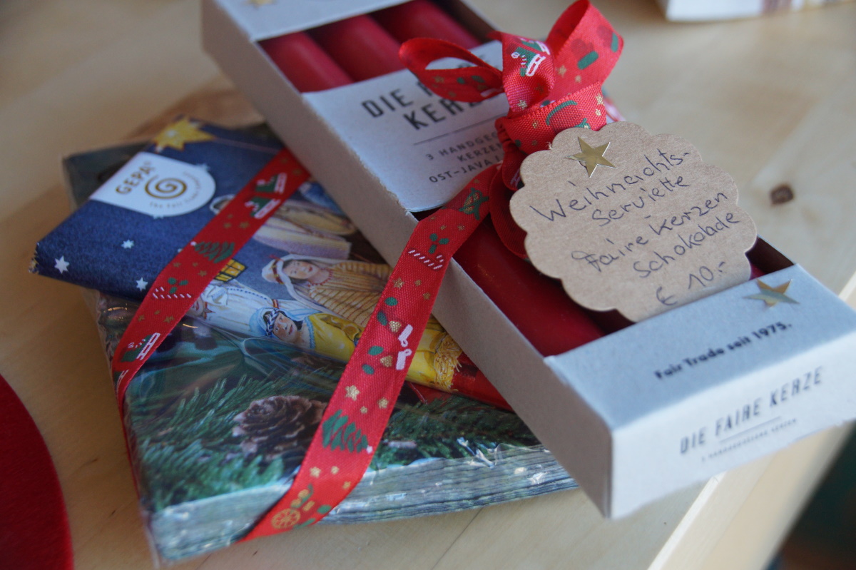 Manchmal kann es ganz praktisch sein, wenn verschiedene faire Produkte geschmackvoll und farblich harmonisch miteinander zu einem schönen kleinen Geschenk verpackt sind. Einige dieser Geschenk-Ideen kann man jetzt schon im Schaufenster des Fairkaufladens bewundern.