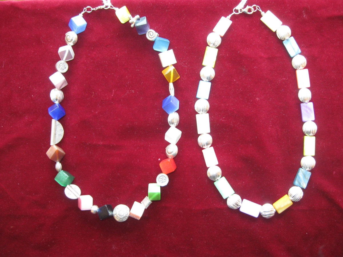 Speziell zum Muttertag bieten wir Ihnen zwei außergewöhnliche Modelle an. In der Kette links sind Silberschnecken und andere filigrane Silberelemente kombiniert mit  bunten Katzenaugen aus Quarzsand. Und bei dem rechten Modell wechseln sich geriffelte Feinsilberlinsen mit gefärbten Perlmuttplättchen ab.