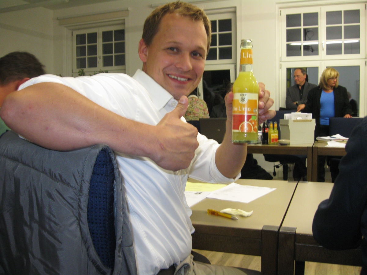 Mir erhobenem Daumen demonstriert CSU – Gemeinderat Andreas Amorth, wie gut ihm die Gepa-Limonade schmeckt, die bei Gemeinderatssitzungen angeboten wird. Neuerdings können sich die Gemeinderäte auch mit fair gehandeltem Studentenfutter wach knabbern – sollten die Sitzungen mal etwas länger dauern…