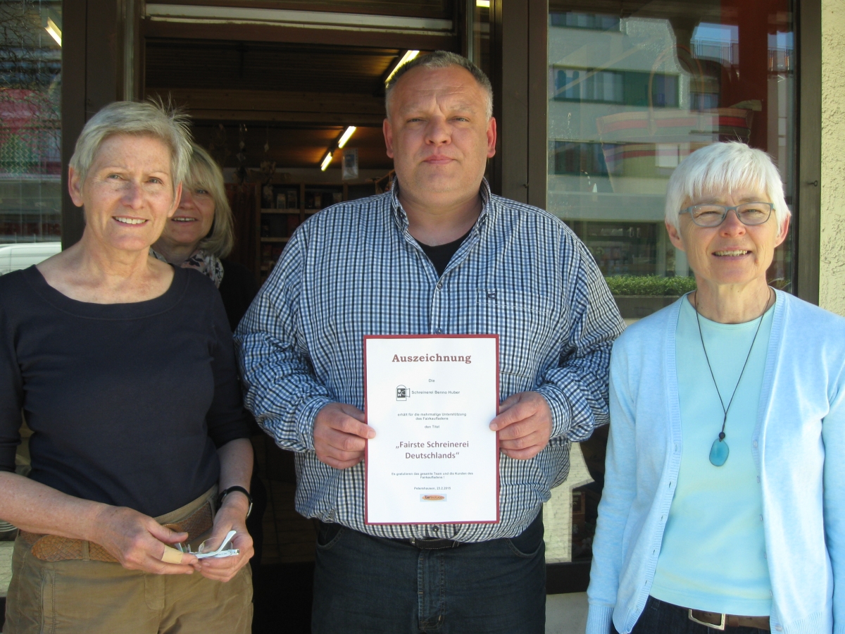 Von gleich drei Damen umringt nahm Benno Huber die Urkunde entgegen. Eine ungewöhnliche, denn der Fairkaufladen kürte die Petershausener Schreinerei (http://benno-huber.de/) zur fairsten Deutschlands.