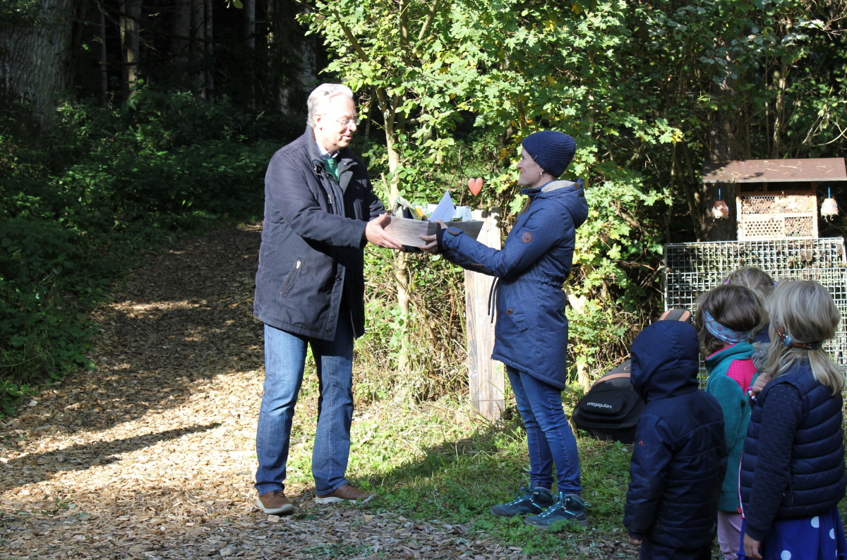 Dieses runde Jubiläum nahm Bürgermeister Marcel Fath dann auch zum Anlass, von Seiten der Gemeinde zu gratulieren, mit einem Geschenkkorb aus dem Fairkaufladen. Gefüllt war dieser mit fair gehandelten Leckereien wie Nüssen, Sesamriegeln, getrockneten Früchten (Mangos, Ananas, Datteln) und – na ja – auch mit ein wenig Schokoladigem für Pädagogen und Kinder.