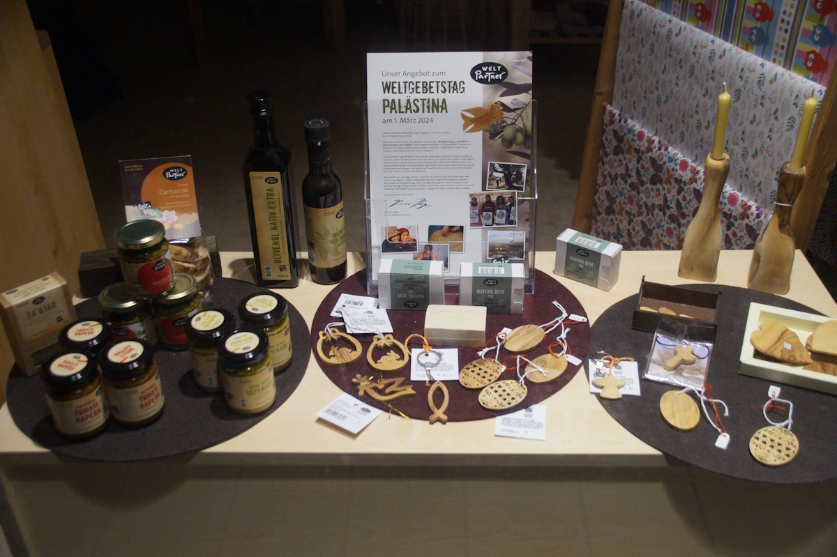 Und so haben wir -speziell zum Weltgebetstag in einem Schaufenster – aber auch für danach Produkte von drei Handelspartnern im Sortiment. Alle drei setzen sich für Frieden in der Region ein und handeln mit Olivenprodukten.